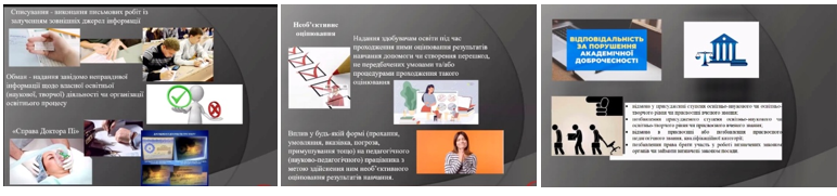 Ольга Біднюк , заступник директора з виховної роботи, закцентувала увагу здобувачів освіти на основних принципах академічної доброчесності, розповіла про найбільш відомі випадки недотримання академічної доброчесності в історії людства, торкнулася питань плагіату, самоплагіату, фальсифікації, списування, хабарництва, необ’єктивного оцінювання тощо. Також, Ольга Святославівна наголосила на академічній відповідальності – це повторне проходження оцінювання (контрольна робота, екзамен, залік тощо); повторне вивчення відповідного освітнього компонента освітньо-професійної програми; відрахування із закладу освіти (крім осіб, які здобувають загальну середню освіту); позбавлення академічної стипендії.