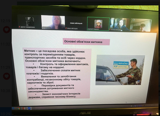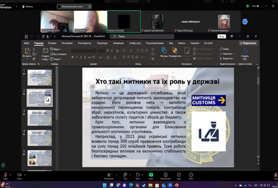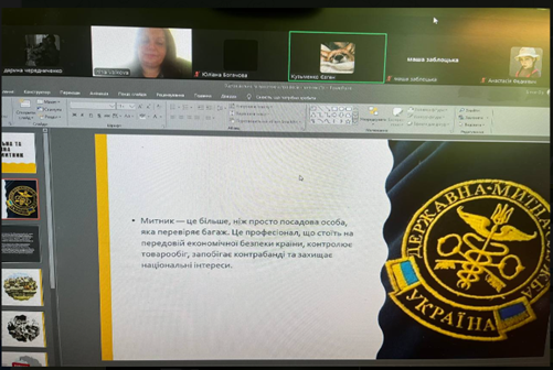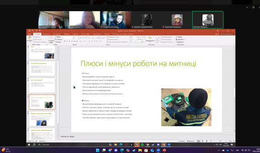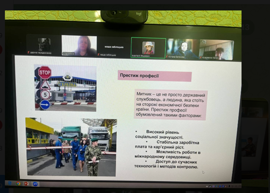 Здобувачі освіти активно обговорювали переваги, перспективи, а також недоліки та ризики, пов’язані з даною професією. У підсумку дискусії дійшли висновку, що професія митника є престижною, важливою та складною, і вона потребує високого рівня відповідальності, аналітичного мислення та моральної стійкості, проте відкриває широкі можливості для кар’єрного росту та самореалізації.