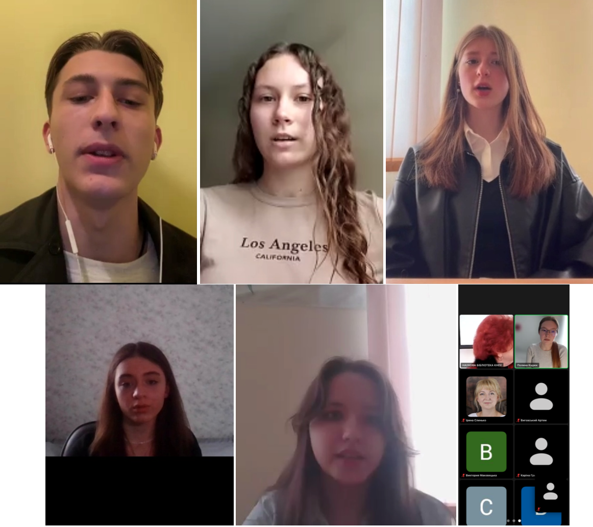 Наші талановиті студенти 1,2 курсу: Грицай Каріна (2 КМ-55), Кадюк Поліна (2КФМ-53), Виговський Артем (1Ф-61), Глущенко Софія (2КМД-56), Бондарчук Єлизавета (1Ф-61), Бендик Валерія (1Ф-61), Маковецька Вікторія  (1Ф-61) в онлайн-форматі декламували вірші Ліни Костенко, а співробітник бібліотеки Герасименко Віталій виконав пісню про кохання на слова поетеси.