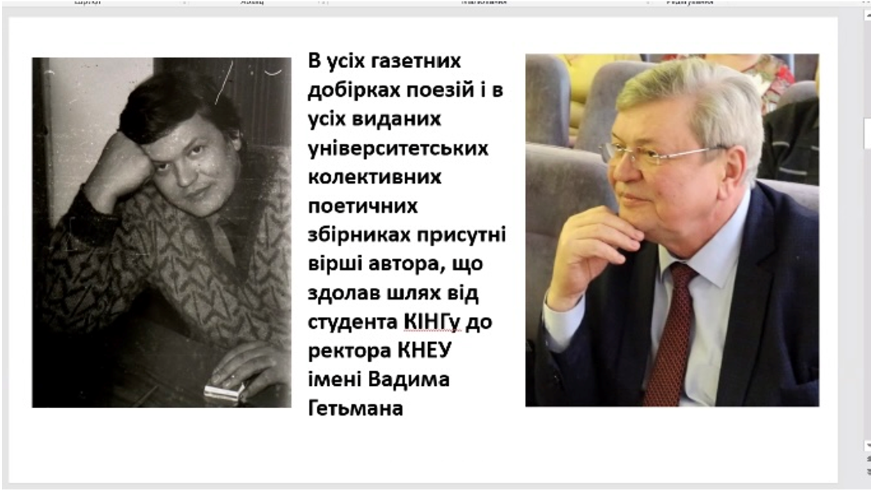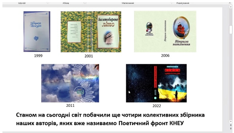Другу частину заходу провела голова правління клубу "Дорогами до прекрасного" КНЕУ, членкиня Національної спілки журналістів України Людмила Рінгіс. Вона акцентувала увагу на тому, що впродовж 1970-2020 років університетська газета "Економіст" висвітлювала літературну творчість наших авторів. Протягом цього періоду світ побачили 4 колективних збірки членів клубу, яких вже називають "Поетичним фронтом КНЕУ". В усіх поетичних збірках присутні вірші автора, що здолав шлях від студента КІНГу до ректора КНЕУ імені Вадима Гетьмана – Дмитра Лук'яненка.
