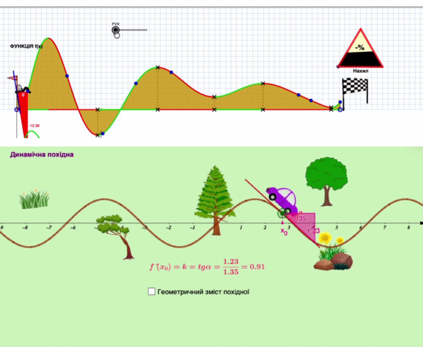 Під час заняття здобувачі освіти мали змогу не тільки ознайомитися з поняттям дотичної та її звʼязком з похідною, а й дослідити взаємодію за допомогою динамічних моделей. Розібрали як дотична повʼязана з рухом автомобіля по нерівній поверхні і як це впливає на дії водія під час руху.