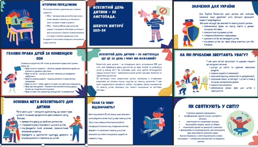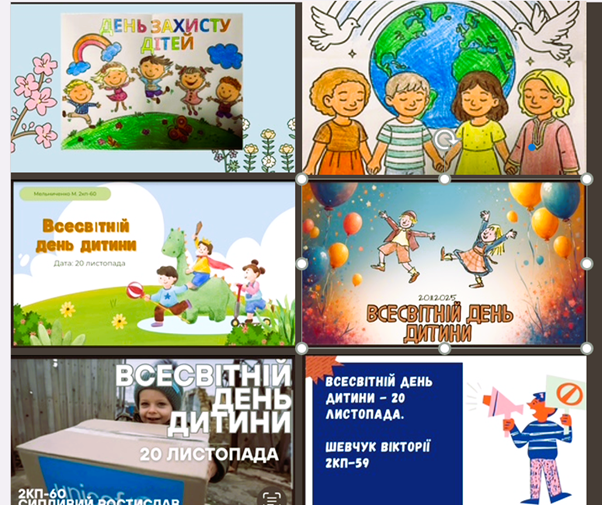 У межах події студенти груп 2КП-59 та 2КП-60: Вікторія Шевчук, Ростислав Сипливий, Анастасія Муляренко, Діана Губська, Мар’яна Мельниченко, Алевтина Олійник та Марія Серветник, під керівництвом викладачів Здоренко О.В. та Кравченко Л.О., підготували змістовні презентації. У своїх роботах вони розкрили основні положення Конвенції ООН про права дитини, проаналізували сучасні виклики у сфері захисту дитинства та окреслили роль державних і громадських інституцій у забезпеченні прав неповнолітніх.