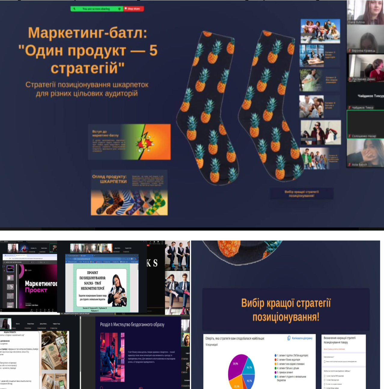 Студенти працювали над розробкою п’яти різних стратегій позиціонування одного продукту, орієнтуючись на різні сегменти ринку та їхні потреби. Кожна команда презентувала свій підхід, аргументуючи вибір цільової аудиторії, каналів просування та ключових повідомлень. Захід пройшов у динамічній та захопливій атмосфері, сприяв розвитку креативного мислення та командної роботи. За результатами онлайн-голосування було обрано переможців батлу: