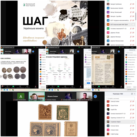 Під час вебінару учасники дізнались про появу та використання монетно-лічильного найменування «шаг» у грошовому обігу України, закріплення цієї історичної назви на законодавчому рівні в грошовому обігу Української Народної Республіки, про те, що завадило ввести шаг у грошовий обіг під час проведення грошової реформи 1996 року.